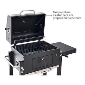 Alimentacao: Carvao Tipo: Bafo e Movel Material: Aco Cor: Preto Dimensoes: 108 cm Altura x 112 cm Largura x 65 cm Profundidade Peso: 7,7 kg Grelha: 65 cm de largura, material em aco Rodizios: 2 rodas para facil movimentacao Acessorios: Tampa com termometro, prateleiras laterais e inferiores, portinhola frontal Garantia: 36 meses Informacoes Resumidas