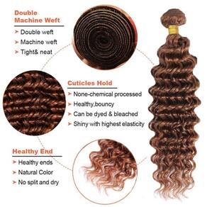 ZevPiul Hair Bundles~Mais bonito e confortável! Especificações do cabelo: 1. Material: 100% cabelo humano brasileiro não processado. 2. Textura: Pacotes de ondas profundas, feixes molhados e ondulados. 3. Tipo de cabelo humano: Cabelo humano Remy brasileiro. 4. Qualidade do cabelo: trama usinada dupla, sem emaranhamento, sem queda, sem cheiro. 5. Cor do cabelo: Feixes de cabelo humano profundo castanho, castanho avermelhado médio. 6. Comprimento do cabelo: Feixes de cabelo de 20 a 76 cm (estique o cabelo para ficar liso e depois meça.) 7. Peso do cabelo: 3 mechas, 100 g/pacote, 300 g no total. 8. Ocasião: Perfeito para uso diário, Halloween, shows, festas temáticas, casamentos, encontros e assim por diante. Perguntas frequentes: P1: Quantos mechas eu preciso para uma cabeça inteira? R1: Normalmente, 3 mechas são suficientes para fazer uma cabeça inteira, mas se você quiser parecer mais longo ou mais cheio, 4 mechas podem ser uma escolha melhor. P2: O cabelo pode ser permanente? A2: pode ser alisado e recortado como desejar, mas tenha cuidado para não exceder 51 °C, caso contrário, danificará o cabelo. P3: Por que a trama do cabelo cai? R3: Assim como nosso cabelo normal, haverá uma pequena perda de cabelo quando o manusearmos com nossas mãos, o que exige que usemos corretamente. P4: Como evitar emaranhamento ou queda de cabelo? A4: Suas extensões de cabelo podem ficar emaranhadas devido à secura, acúmulo de gordura e sujeira. Lave o cabelo com um bom xampu e condicionador e penteie suavemente o cabelo com os dedos. Certifique-se de limpar e aparar pelo menos uma vez por semana. Lembrete: 1. Lave o cabelo regularmente. 2. Desembarace o cabelo suavemente antes de lavar. Não esfregue ou torça. 3. Adicione xampu suave à água fria e mexa o cabelo até limpar. Enxágue completamente. - ?Material dos feixes de cabelo humano?: mechas de cabelo humano virgem brasileiro não processado, cabelo humano ondulado profundo, macio e saudável para costurar ou perucas. - ?Vantagem dos pacotes de cor nº 30?: trama de máquina dupla, justa e limpa, queda mínima, sem emaranhamento, sem cheiro, fácil de cuidar, dura mais. - ?Cor marrom com ondas profundas?: Os pacotes são de cor pura 30, marrom claro. Pode ser alisado, enrolado, estilizado como seu próprio cabelo. - ?Peso e comprimento do cabelo?: 95-105 g/mechas, (cerca de 93 a 99 g/peça), 20 a 76 cm, múltipla escolha, peso total e fiel ao comprimento. - ?Mais bonito?: perfeito para uso diário, Halloween, Natal, shows, festas temáticas, casamentos, encontros e assim por diante, deixa você mais bonita e confiante!