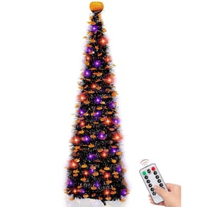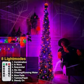 Especificação: Tamanho: Altura: 6 pés Largura: 15 polegadas. Luzes de corda: 19,7 pés Abóbora superior: 2,5* 1,5 polegadas (largura* altura). Lantejoulas de abóbora: 1,5* 1 polegada (W* H). Caixa de cores: 13* 13,5* 3 polegadas (comprimento* largura* altura). Cor do produto: preto+laranja. Peso: 2,7 libras Aparência: lantejoulas de abóbora + Glitter Pumpkin Top + enfeites pretos. Número de luzes: 60 luzes LED (30x laranja+30x roxo). Cor da iluminação: laranja + roxo. Modo de iluminação: estável. Outras funções: cronômetro (6 horas ligadas/18 horas desligadas). Material: PVC+metal. Embalagem: caixa de cor. Cena aplicável: festa de Halloween, entrada, sala de estar, lareira, parapeito da janela, próximo a escadas, varanda, shopping center, quarto infantil. O pacote inclui: 1 x árvore de enfeites de Halloween 1 x luzes de corda Dica: 1. Você mesmo pode adicionar alguns enfeites na árvore, mas ela não deve ser muito grande nem muito pesada, para não sobrecarregar a árvore. 2. Esta árvore de Halloween é inflamável, por favor, mantenha-se longe do fogo. - Árvore de ouropel preta de 6 pés: árvore de ouropel preta de Halloween decorada com tampo de abóbora brilhante pré-instalado e lantejoulas de abóbora, com 6 pés de altura e 15 polegadas de largura - Luzes de corda laranja e roxa DIY de 60 LED: Uma luz de corda LED de 19,7 pés e 60 é embalada individualmente para configuração DIY. Ele brilha constantemente com luzes laranja e roxas, 30 LED de cada cor. Fio preto para facilitar a ocultação. Alimentado por pilhas 3AA (não incluídas) - Temporizador e controle remoto de 8 modos::Você pode usar o interruptor Off/On/Timer na caixa da bateria para ajustar o cronômetro para as luzes. Com o temporizador ligado, ele acenderá por 6 horas e ligará novamente 18 horas depois. Ele circulará todos os dias até você desligar a função de temporizador - Fácil de configurar e armazenar: feito de materiais de suporte de PVC e metal com suporte transversal durável e estável. A árvore de Halloween dobrável tem um design dobrável e pode ser facilmente instalada ou desmontada em várias partes. Flexível e ajustável: os galhos dos áceres de mesa de outono têm fios de metal dobráveis no interior, permitindo que você ajuste livremente a postura da folha e das flores artificiais para criar uma forma natural de árvore