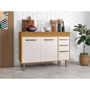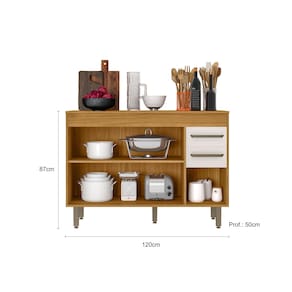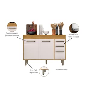 MDPA estrutura conta com dobradiças metálicas de 26mm, 1 prateleira interna que suporta até 4kg e puxadores em polímero na cor bronze, que agregam elegância ao visual do móvel. Os pés reguláveis de 17cm em PVC modelo pirâmide garantem estabilidade e nivelamento, mesmo em pisos irregulares.