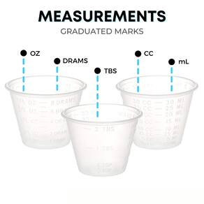 - Todos os copos vêm com um design de plástico transparente que apresenta medidas gravadas e fáceis de ler em CC, ML, Drams, TBS, TS e fl. OZ. Uma ótima ferramenta para medir medicamentos e uma variedade de outros líquidos