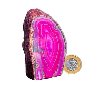 Ágata Rosa – Pedra Natural de Qualidade para Decoração e Bem-Estar Transforme seu espaço com a beleza única e a energia suave dos Geodos de Ágata Rosa. Essas pedras naturais são ideais para quem busca dar um toque especial à decoração da casa, ou para quem deseja utilizar em práticas esotéricas, trazendo equilíbrio e harmonia ao ambiente. Características do Produto:\nNome: Ágata Rosa Tamanho das Pedras: Entre 7 a 12 cm (tamanhos podem variar conforme o estoque disponível) Cor: Rosa Peso Médio por Pedra: 350 a 400g Qualidade: Comum (ideal para quem busca pedras naturais acessíveis com ótimo custo-benefício)\nDestaques:\nPedras Naturais: Cada geodo é uma peça única, extraída diretamente do garimpo, com tonalidades e formas exclusivas. As pedras podem apresentar pequenas inclusões, características que as tornam ainda mais autênticas. Acabamento Polido e Base Serrada: A face da pedra é polida, e a base serrada garante que a pedra fique firme e estável, perfeita para ser exibida em prateleiras ou mesas decorativas. Energia Positiva e Harmonia: A Ágata Rosa é conhecida por suas propriedades de equilíbrio emocional e tranquilidade, tornando-se uma excelente opção para quem busca um ambiente sereno e acolhedor. Variações Naturais: Como se trata de uma pedra natural, cada geodo apresenta padrões e cores diferentes, garantindo que cada peça seja única e exclusiva. Tratamento com Óleo Mineral: As pedras são tratadas com óleo mineral para manter seu brilho e beleza naturais por mais tempo.\nImportante:\nO produto é 80% tingido, uma prática comum no mercado de Ágata para realçar suas cores naturais. As fotos são ilustrativas e podem variar conforme o lote e as características das pedras.\nPor que comprar conosco?\nProduto Único e Exclusivo: Cada Geodo de Ágata Rosa é uma peça única, perfeita para decoração e para quem valoriza a energia das pedras naturais. Qualidade e Preço Justo: Oferecemos pedras naturais de qualidade com um preço acessível, ideal para quem deseja investir em itens exclusivos sem comprometer o orçamento. Entrega Rápida e Segura: Garantimos a entrega eficiente e a qualidade do produto, para que possa desfrutar de sua nova peça o mais rápido possível.\nCompre Agora e Traga Harmonia para o Seu Ambiente com Geodos de Ágata Rosa! Por que comprar na Distribuidora Cristais de Curvelo? Compromisso com o Meio AmbientePriorizamos a sustentabilidade, utilizando 90% de embalagem reciclável e grande parte biodegradável. Nossos garimpos seguem rigorosamente as normas ambientais estabelecidas pelas leis vigentes, assim como nossas lapidações. Além disso, adotamos práticas de reciclagem de água, aproveitamento de retalhos de pedras e uso de discos diamantados, com a meta de atingir 100% de reciclagem em nossos processos. Marca: CristaisdeCurvelo