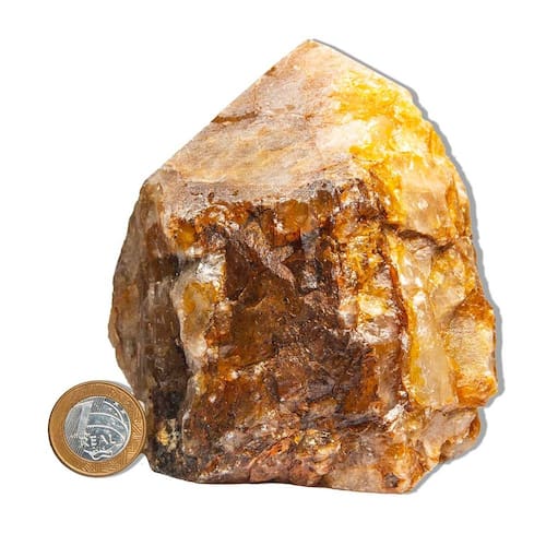 Hematoide Amarelo Bruto com Base Serrada – Pedra Natural para Decoração e Energia Revigorante. Descubra o magnetismo solar da Pedra Hematoide Amarelo Bruto, uma joia da natureza que combina beleza vibrante e presença energética marcante. Com tonalidades que oscilam entre o dourado, o âmbar e o amarelo intenso, essa pedra irradia calor, clareza e vitalidade, criando uma atmosfera acolhedora e revigorante em qualquer ambiente. Sua base serrada garante estabilidade para exposição vertical, ideal para composições decorativas que buscam um ponto de luz natural, energia positiva e sofisticação terrosa. Perfeita para quem valoriza peças com personalidade, cor e conexão energética autêntica. Dimensões e Peso Aproximado\nPeso por unidade: entre 1 a 1.5kg Tamanho aproximado: 15 a 25cm\nHematoide Amarelo Bruto com Pé e Bico Serrado – Conexão com a Vitalidade Interior Uma pedra que irradia poder, energia e transformação. O Hematoide Amarelo Bruto com pé e bico serrado Tipo B não é apenas uma peça mineral: é um portal para o equilíbrio entre força, clareza mental e vitalidade emocional. Ideal para quem busca autenticidade na decoração, profundidade nas práticas espirituais e uma presença energética firme no ambiente. Propriedades Energéticas e Simbólicas O Hematoide Amarelo combina a energia estabilizadora da hematita com os tons vibrantes do quartzo amarelo, resultando em um cristal de poder incomparável. Reconhecido por fortalecer a mente, alinhar as emoções e promover a autoconfiança, ele é um excelente aliado na transmutação de energias densas e no desbloqueio dos centros energéticos. Atua especialmente sobre o chakra do plexo solar, fortalecendo a determinação e a vitalidade interna. Usos Sugeridos Esta peça é extremamente versátil: pode ser usada como elemento de destaque em decoração consciente, em altares pessoais, em práticas meditativas voltadas ao foco e à coragem, ou como ferramenta energética em terapias holísticas como o Reiki, a cristaloterapia e a harmonização de ambientes. Também é uma escolha marcante para colecionadores de minerais que apreciam a beleza da natureza em estado bruto. Curiosidade e Valorização Conhecido também como "Fire Quartz" (Quartzo Fogo), o Hematoide é tradicionalmente ligado a culturas que valorizam a união entre força de ação e clareza de pensamento. É considerado um cristal de ancoragem emocional, frequentemente utilizado por praticantes de meditação ativa e técnicas de empoderamento pessoal. Classificação por Qualidade\nTipo A – Qualidade superior: cores mais intensas, menos inclusões, forma bem definida, excelente para fins estéticos e espirituais exigentes. Tipo B – Qualidade intermediária: tonalidade variada, pequenas imperfeições naturais, ideal para terapias, uso pessoal e decorações rústicas. Tipo C – Qualidade econômica: mais rústico e com maior grau de variação visual.\nInformações Técnicas\nAcabamento: base (pé) e ponta (bico) serradas manualmente para melhor estabilidade e apresentação\nSobre Variações Naturais Por se tratar de uma pedra natural bruta, cada peça é absolutamente única. Variações de cor, forma, textura e microfissuras fazem parte do charme autêntico de um mineral não industrializado, refletindo sua origem e jornada geológica. Essas particularidades não comprometem a beleza nem a função energética da pedra — pelo contrário, as tornam ainda mais especiais. Tratamentos e Cuidados Esta peça pode receber hidratação com óleo mineral para realce visual e proteção superficial. A lapidação do pé e bico é realizada artesanalmente, respeitando as características naturais da matéria-prima. Sustentabilidade e Compromisso Ambiental<