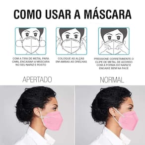 - Coloque a máscara em frente ao rosto, cobrindo as áreas do nariz e da boca, e prendendo o elástico na orelha e molde o clipe ao seu nariz.