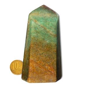 Ponta de Aventurina Verde: Prosperidade, Equilíbrio e Energia Positiva para o Seu Ambiente A Ponta de Aventurina Verde é uma verdadeira joia da natureza! Com seu tom verde suave e vibrante, ela traz beleza e significado ao seu espaço. Muito além de um item decorativo, essa pedra é conhecida por atrair prosperidade, estimular o equilíbrio emocional e renovar as energias ao seu redor. Características da Ponta de Aventurina Verde:\nNome da Pedra: Aventurina Verde\nCor: Verde Natural (Fotos ilustrativas – pode haver variações de tom)\nFormato: Ponta Sextavada (Gerador)\nClaridade: Levemente translúcida a opaca, com brilho suave\nMedidas Aproximadas: 9 a 11cm (varia conforme o estoque)\nPeso Médio: Entre 200 e 300g\nOrigem: Brasil\nTratamento: Hidratação com óleo mineral, preservando suas propriedades naturais\nPropriedades e Benefícios da Aventurina Verde:\nProsperidade e Abundância: Tradicionalmente conhecida como a “pedra da sorte”, a aventurina verde é associada à atração de oportunidades, prosperidade financeira e crescimento pessoal.\nRenovação das Energias: A aventurina age como um filtro energético, limpando o ambiente de negatividades e promovendo uma atmosfera mais leve e positiva.\nHarmonia e Vitalidade: Ideal para ambientes de descanso, trabalho ou meditação, sua vibração natural contribui para o bem-estar físico, mental e espiritual.\nBeleza e Decoração: Além de suas propriedades energéticas, a Ponta de Aventurina Verde é uma peça decorativa elegante, perfeita para salas, escritórios, consultórios ou altares espirituais.\nCuidado e Autenticidade: Por ser uma pedra natural, cada peça apresenta nuances únicas de cor, textura e pequenos veios internos – características que comprovam sua autenticidade e origem de garimpo. Importante: Pequenas inclusões, variações de tom ou marcas internas são normais em pedras naturais e não são consideradas defeitos. Conclusão: A Ponta de Aventurina Verde é mais do que um objeto decorativo: ela é um símbolo de renovação, sorte e harmonia. Traga a energia positiva desta pedra para o seu dia a dia e transforme o ambiente com equilíbrio e boas vibrações! Garanta a sua agora e sinta a diferença que a energia da Aventurina Verde pode fazer em sua vida! Marca: Não Informado