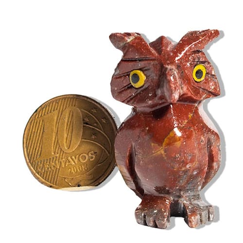 Escultura de Coruja em Pedra Natural de Dolomita Vermelha - Uma Elegância que Transmite Sabedoria Adquira agora uma escultura única e elegante de coruja em pedra natural de dolomita vermelha, a escolha perfeita para elevar a decoração de qualquer ambiente. Com uma estética refinada e simbólica, esta peça não apenas enriquece seu espaço, mas também carrega o significado de sabedoria, mistério e inteligência, tornando-se um presente ideal para quem aprecia arte e decoração. Características da Escultura: Material: Pedra Natural de Dolomita Cor: Vermelha vibrante, que traz vida e cor à sua decoração. Corte: Lapidado manualmente por artesãos habilidosos, garantindo um acabamento exclusivo. Claridade: Denso, com brilho de verniz, proporcionando um toque suave ao contato. Dimensões Aproximadas: 4 x 2,2 cm, perfeita para ser exibida em mesas, prateleiras ou estantes. Peso Aproximado: 20 g, leve e fácil de acomodar em diferentes espaços. Origem: Cristais de Curvelo, reconhecidos pela qualidade de suas pedras. Por Que Escolher Esta Escultura? Simbolismo Poderoso: A coruja é um símbolo amplamente reconhecido de sabedoria e proteção, tornando-a uma adição significativa à sua decoração. Peça Única: A dolomita vermelha apresenta variações em tonalidade e grafismo, garantindo que cada escultura seja verdadeiramente única. Versatilidade: Ideal para decoração de casas, escritórios ou como um presente marcante e significativo. Atenção: Por ser uma peça feita de pedra natural, podem ocorrer variações em suas tonalidades e grafismos. Pequenas inclusões que podem se assemelhar a fissuras são características normais de minerais autênticos de garimpo. A escultura recebe hidratação com óleo mineral para preservar sua beleza. Não perca a oportunidade de enriquecer sua decoração com esta escultura de coruja em dolomita vermelha! Peça agora mesmo e adicione um toque de elegância e significado ao seu lar! Marca: CristaisdeCurvelo