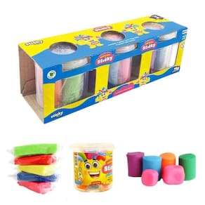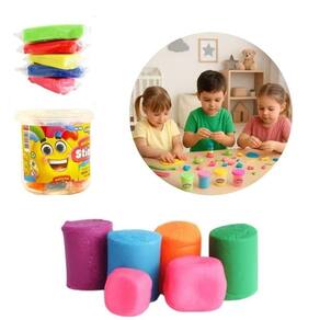 Cada pote contém cinco cores diferentes de massinha, com textura macia e fácil de moldar, perfeita para criar formas, personagens e explorar o universo da imaginação.