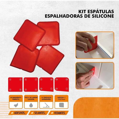 Kit Espátulas Espalhadoras de Silicone A solução completa para um acabamento impecável Ideal para serviços de marcenaria, vidraçaria, serralheria entre muitos outros que prezem por um acabamento perfeito na aplicação de seu selante. - 14 ângulos diferentes para atender a todas as suas necessidades. - Fácil de limpar. - Utilizadas em adesivos, selantes e vedantes. - Tamanho compacto: 77x77mm. Perfeito para quem busca precisão, praticidade e qualidade no trabalho. Transforme seus projetos com o acabamento que você merece Marca: Não Informado Ean: 7898512372301