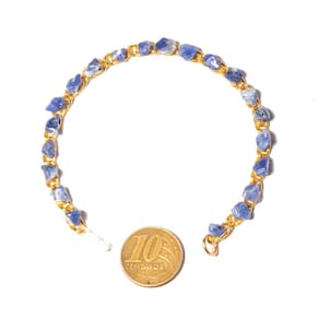 Material da Pulseira: Metal com banho dourado, com elos de corrente para um design moderno e versátil. Nome da Pedra: Sodalita Azul. Cor da Pedra: Azul profundo com rajas brancas naturais (foto ilustrativa). Claridade e Brilho: Alto brilho, destacando a beleza natural da pedra. Lapidação da Pedra: Rolada, com acabamento suave e natural. Tamanho da Pulseira: 18,6 cm aberta – se ajusta confortavelmente à maioria dos pulsos. Tamanho da Pedra: Aproximadamente 5 x 6 mm.