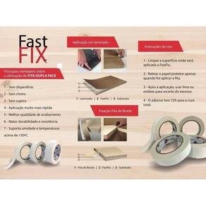 A fita dupla face fastfix substitui a cola de contato para colagem de fita de borda, laminado ou engrosso de peça na marcenaria, com colagem super resistente é ideal para serviços que presem pela qualidade no acabamento, além da resistência a umidade e temperatura.Disponível nas medidas de 22, 35 e 64mm por 10 metros linearesprincipais vantagens da utilização da fita fast fix- sem desperdício- sem cheiro- sem sujeira- aplicação muito mais rápida- melhor qualidade de acabamento- maior durabilidade e resistência- suporta umidade e temperaturas acima de 150ºcinstruções de uso1 - limpar a superfície onde será aplicado a fastfix.2 - retirar o papel protetor apenas quando for aplicar a fita.3 - após a aplicação, usar lima ou estilete para recorte do excesso.4 - o adesivo tem 72h para a cura total.Armazenamento24 meses em embalagem fechada em local seco e fresco, a temperaturas entre + 5 c e 27 c.Para o armazenamento adequado manter estocado na metade inferior desta faixa de temperatura Marca: Não Informado