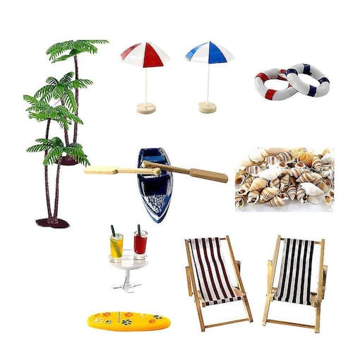 Description_x000D__x000D_This item é um conjunto de miniaturas de resina e ornamento de paisagem de resina criativa. O seu design de mini elementos de jardim torna-o adequado para micro paisagem. Para DIY uma fada como jardim da casa de bonecas por si só e torná-lo um bom presente para as crianças. Feito de material de resina durável para uso a longo prazo. Não é fácil decair como miniature._x000D__x000D_Features _x000D__x000D_ de madeira real- Cor: Como shown._x000D_- Material: Resin._x000D_- Tamanho: Cerca de 14 x 5 x 6 cm._x000D_- Tamanho do pacote: 20 x 15 x 10cm._x000D_- Conjunto inclui 18 estilos diferentes mini elementos de praia decoração casa de boneca accessories._x000D_- Item inclui 1 Pc guarda-sol vermelho, Guarda-sol azul, espreguiçadeira listrada azul, espreguiçadeira listrada vermelha, mesa redonda branca, copos de bebida, barco, boia de vida vermelha, boia de vida azul, prancha de surf amarela, 1 pá de par, 1 pacote de areia azul, 1 pacote de conchas, 2 pcs coqueiro (14cm) e 2 pcs dolphins._x000D_- Feito de resina sintética premium, durável para uso a longo prazo e não é fácil de deform._x000D_- Para DIY uma fada como praia de casa de bonecas por si só e torná-lo um bom presente para kids._x000D_- Acabamento fino fazê-lo não desaparecer facilmente. adereços de jardinagem, adequados com pequena jardinagem decorativa. Lista de embalagem1 x sol vermelho umbrella_x000D_1 x umbrella_x000D_1 de sol azul x chair_x000D_1 de salão listrado azul x chair_x000D_2 de salão listrado vermelho x _x000D_1 de coqueiro de 14cm x table_x000D_2 redonda branca x cups_x000D_1 de bebida x par de 1_x000D_1 de barco x pacote de _x000D_1 de remo x pacote de _x000D_1 de areia azul x Shells _x000D_1 x vida vermelha buoy_x000D_1 x vida azul buoy_x000D_1 x surfboard_x000D_2 amarelo x golfinhos