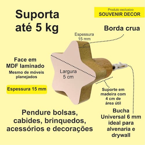 A face vai colada com super cola e acaba sendo apenas decorativa, pois é o suporte quem recebe o esforço, suportando até 5 Kg. Anúncio referênte à 1 unidade. Modelo: Estrela Tamanho da face: 5,0cm X 5,0cm; Material: MDF laminado 15mm melamínico | borda cru Cor: Rosa, Azul, Branco e Cinza