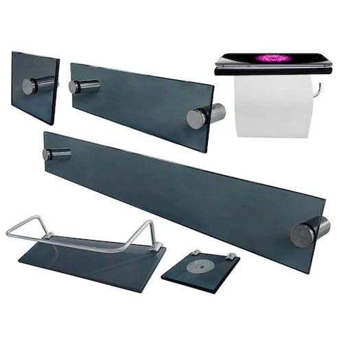 - 1 Saboneteira reta 10x12 cm Fumê - 1 Porta shampoo 10x30 cm Fumê - 1 Porta toalha de banho 8x60 cm Fumê - 1 Porta toalha de rosto 8x30 cm Fumê - 1 Cabide 10x10 cm Fumê - 1 Papeleira 12x14 cm c\ suporte para celular Fumê
