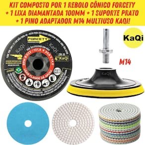 1 Lixa Grão 4 Pol. 100mm Diamantada + 1 Rebolo Cônico 45 Graus + 1 Disco Prato + 1 Pino M14 KaQi GRÃO: 1 Lixa g3000 + Kit Kit 1 Lixa Diamantada Disco 4 Polegadas 100mm KaQi + 1 Rebolo Grão 120 Copo Cônico 45 Graus 4 Polegadas M14 Forcety. + 1 Suporte Prato Disco 100mm M14 KaQi + 1 Pino Adaptador Multiuso Rosca Universal M14 KaQi. Para Desbastes, Polimentos, Acabamentos, Boleamentos, Lixamentos a Seco e Úmido. Ideal para profissionais e entusiastas de reformas e construção. Alta qualidade, resistência e desempenho superior. Transforme o acabamento das suas superfícies com o Kit 1 Lixa Grão 4 Pol. 100mm Diamantada + 1 Rebolo Cônico 45 Graus + 1 Disco Prato + 1 Pino M14 Desenvolvido para oferecer o melhor polimento e acabamento, é perfeito para quem busca resultados profissionais, tanto em pedras como granitos, mármores, cerâmicas, quanto ardósia, calcário, dekton, quartzo, porcelanato, pedra projetada, concreto, nanoglass, super nano, vidro e muito mais. Seu lixamento pode ser a seco e a úmido, o que proporciona um processo mais rápido, sem gerar calor excessivo. Assim, é possível garantir um resultado sem manchas ou falhas, e ainda favorece um efeito brilho d'água incrível O Rebolo Copo Cônico 10x5cm Grão 120 Forcety é ideal para desbastes, retificações, boleamentos e acabamentos. Projetado para oferecer eficiência, durabilidade, confiabilidade e resultados excepcionais, é perfeito para profissionais e entusiastas de reformas e construções. Não à toa, é o rebolo número 1 das marmorarias, azulejistas e oficinas de todo Brasil O Disco 100mm e o pino adaptador M14 podem ser utilizados em conjunto com as lixas e com o rebolo. Com sistema de gruda e desgruda fácil, podem utilizadas em lixadeiras, esmerilhadeiras, politrizes, furadeiras, parafusadeiras. Permite, assim, ampliar a gama de usos do kit. Modo de uso: aceita lixamento tanto, a úmido, quanto, a seco. No úmido utiliza-se com uma politriz úmido de qualquer marca que aceite um prato com rosca M14 ou máquina polidora utilizada em indústrias de mármore e granito para polimento nas bordas da pedra. Quando o uso é a seco, aceita lixadeiras, esmerilhadeiras e politrizes comuns. Em ambos os casos, basta encostar o costado de vellcro ao disco prato suporte que também tenha o mesmo sistema, e então fazer o devido uso. Conteúdo da embalagem: 1 Lixa DÁgua 4 Pol. 100mm Disco Diamantado KaQi GRÃO. + 1 Rebolo Grão 120 Copo Cônico 45 Graus 4 Polegadas M14 Forcety. + 1 Suporte Prato Disco 100mm M14 KaQi + 1 Pino Adaptador Multiuso Rosca Universal M14 KaQi. Especificações Lixa: Diâmetro: 100mm 4 Polegadas . Furo central: 1,3cm diâmetro. Espessura 1 unidade: 0,4cm. Maleabilidade: flexível. Lixamentos: seco e úmido. RPM: ideal entre 3000 a 5000 rotações por minuto. Material da lixa: diamante sintético industrial e resina premium. Costado: tipo vellcro. Fácil de fixar e remover. Especificações Rebolo: Trabalho: a seco ou refrigerado com água. Diâmetro: 4 Polegadas 100mm 10,16cm x altura 5,08cm. Velocidade: 9023RPM. Rosca: M14. Material: Carbeto de Silício SiC com diamantes. Feito para ser conforme norma ABNT NBR 15230. Especificações Prato Suporte: Diâmetro do disco: 100mm 4 Polegadas . Modelo do disco: M14 com superfície tipo vellcro. RPM: até 12000. Rosca: padrão M14 14mm . Especificações Pino Adaptador M14: Para Furadeira Parafusadeiras, Politrizes, Lixadeiras e Esmerilhadeiras. Fixa em discos pratos M14 para uso com lixas, boinas, espumas de polir, entre outros acessórios. Rosca: M14 14mm . Pino largura: 8mm. Altura total: 4,4cm.