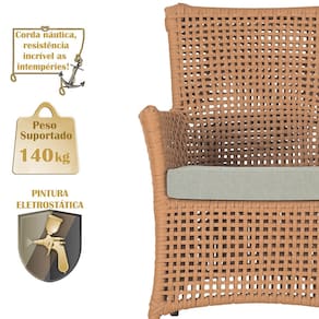 A corda náutica adiciona um toque de rusticidade moderna, enquanto o estofado impermeável garante que sua poltrona esteja sempre impecável, mesmo após uma chuva inesperada ou um acidente com líquidos.