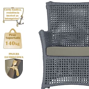 A corda náutica adiciona um toque de rusticidade moderna, enquanto o estofado impermeável garante que sua poltrona esteja sempre impecável, mesmo após uma chuva inesperada ou um acidente com líquidos.