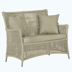 A corda nautica adiciona um toque de rusticidade moderna, enquanto o estofado impermeavel garante que sua Sofa esteja sempre impecavel, mesmo apos uma chuva inesperada ou um acidente com liquidos.