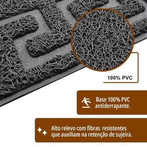 VANTAGENS - Superfície em alto relevo, retém a sujeira; - Fibras resistentes, não solta pelos; - Base emborrachada antiderrapante; - Evita tropeços, não levanta as pontas; - Material firme e pesado, não sai do lugar; - Antimofo, pode molhar; - Alta qualidade e ótimo acabamento; - Para ambientes externos e internos; - Super fácil de limpar. CONTÉM: 1 unidade(s) COR: Grafite DIMENSÕES - Largura: 60cm - Comprimento: 90cm MATERIAL: 100% PVC SUPER FÁCIL DE LIMPAR - Limpeza Leve: Sacudir o tapete ou utilizar o aspirador em pó. - Limpeza Pesada: Lavar com água e sabão neutro. Um produto Idealiza Comércio de Utilidades.