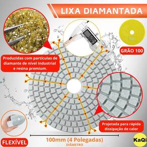 Transforme o acabamento das suas superfícies com a Lixa Diamantada 4 Polegadas 100mm da KaQi + o Disco Suporte Prato 4 Polegadas 100mm Desenvolvida para oferecer o melhor polimento e acabamento, é perfeito para quem busca resultados profissionais, tanto em pedras como granitos, mármores, cerâmicas, quanto ardósia, calcário, dekton, quartzo, porcelanato, pedra projetada, concreto, nanoglass, super nano, vidro e muito mais. Seu lixamento pode ser a seco e a úmido, o que proporciona um processo mais rápido, sem gerar calor excessivo. Assim, é possível garantir um resultado sem manchas ou falhas, e ainda favorece um efeito brilho d'água incrível