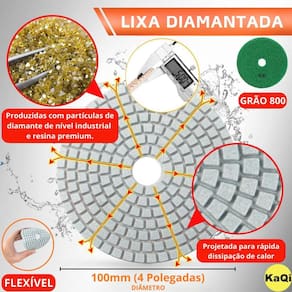 Transforme o acabamento das suas superfícies com a Lixa Diamantada 4 Polegadas 100mm da KaQi Desenvolvida para oferecer o melhor polimento e acabamento, é perfeito para quem busca resultados profissionais, tanto em pedras como granitos, mármores, cerâmicas, quanto ardósia, calcário, dekton, quartzo, porcelanato, pedra projetada, concreto, nanoglass, super nano, vidro e muito mais. Seu lixamento pode ser a seco e a úmido, o que proporciona um processo mais rápido, sem gerar calor excessivo. Assim, é possível garantir um resultado sem manchas ou falhas, e ainda favorece um efeito brilho d'água incrível