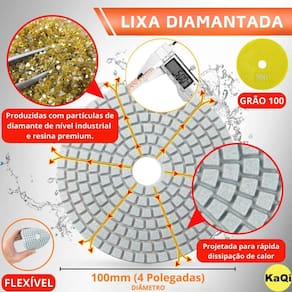 Transforme o acabamento das suas superfícies com a Lixa Diamantada 4 Polegadas 100mm da KaQi Desenvolvida para oferecer o melhor polimento e acabamento, é perfeito para quem busca resultados profissionais, tanto em pedras como granitos, mármores, cerâmicas, quanto ardósia, calcário, dekton, quartzo, porcelanato, pedra projetada, concreto, nanoglass, super nano, vidro e muito mais. Seu lixamento pode ser a seco e a úmido, o que proporciona um processo mais rápido, sem gerar calor excessivo. Assim, é possível garantir um resultado sem manchas ou falhas, e ainda favorece um efeito brilho d'água incrível