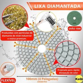 Transforme o acabamento das suas superfícies com a Lixa Diamantada 4 Polegadas 100mm da KaQi Desenvolvida para oferecer o melhor polimento e acabamento, é perfeito para quem busca resultados profissionais, tanto em pedras como granitos, mármores, cerâmicas, quanto ardósia, calcário, dekton, quartzo, porcelanato, pedra projetada, concreto, nanoglass, super nano, vidro e muito mais. Seu lixamento pode ser a seco e a úmido, o que proporciona um processo mais rápido, sem gerar calor excessivo. Assim, é possível garantir um resultado sem manchas ou falhas, e ainda favorece um efeito brilho d'água incrível