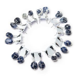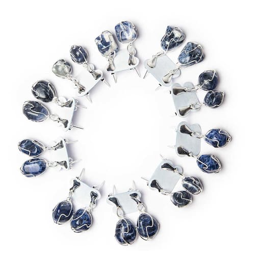 Este brinco combina os tons profundos e marcantes da Sodalita Azul rolada e polida com um design chique e artesanal: um delicado cesto amarradinho, montado manualmente. Um acessório com elegância natural, perfeito para quem busca estilo com significado, equilíbrio e boas vibrações. A base metálica recebe acabamento prateado sobre metal niquelado, criando um contraste sutil que valoriza os azuis intensos e os veios claros característicos dessa pedra. Detalhes da Peça
