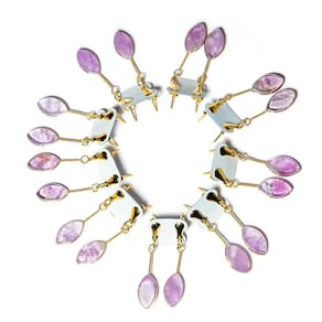 Brinco com Pedra Ametista Natural Navete Delicado, artesanal e cheio de charme. Este brinco é confeccionado com pedra natural Ametista em corte navete, lapidada manualmente com acabamento folha. A montagem é feita com mergulho flash dourado, garantindo brilho e elegância em cada detalhe. Detalhes do Produto: