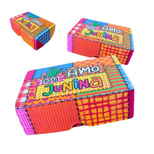 Impressão de alta qualidade em papel offset 240g fosco 5 opções de estampas temáticas juninas vibrantes e acabamento gráfico fosco Montagem fácil e rápida por encaixe sem necessidade de cola Versatilidade para embalar paçoquinhas, brigadeiros, docinhos, lembrancinhas e pequenos mimos
