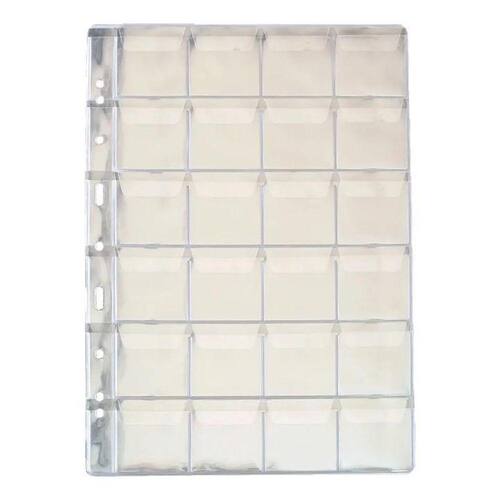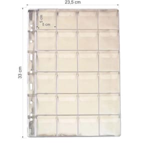 10 folha plastico moedas 24 divisões furo universal com aba Especificações - altura: 32,5 cm - largura: 23 cm - bolsos: 4,9 cm x 4,9 cm - furação: universal- 24 bolsos por folhas- material: pvc cristal Não cabe coin holder Marca: Ljl.Etc