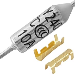 Lote com 10 unidades de fusível térmico 240c 10a 250v para uso geral 240 graus + 20 terminais luva tipo u para emenda. Trabalha em qualquer tensão entre 0 e 250v 12v/110v/127v/220v