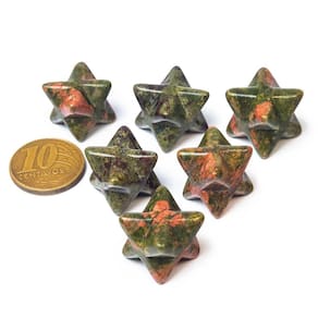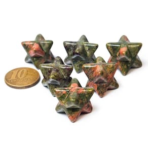 10 Merkabah de Unakita Importada – Estrela Merkabah Lapidada com Maestria Eleve sua vibração espiritual com a poderosa Merkabah de Unakita, uma joia energética única, esculpida com precisão na forma sagrada da estrela Merkabah. Com 15 x 15 mm de medidas e 25 quilates de peso, esta peça de origem importada combina a beleza natural da Unakita com a geometria sagrada para apoiar processos de cura, equilíbrio emocional e expansão da consciência. Detalhes do Produto: