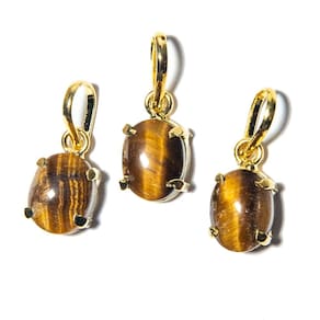 Mini Ponto de Luz Liso Olho de Tigre | Cabochão Liso na Garra Um pingente delicado, elegante e repleto de força simbólica. O Olho de Tigre é conhecido por sua coloração marcante e energia protetora. Com corte cabochão liso e montagem em garra, este pingente combina sofisticação com espiritualidade, sendo ideal tanto para o uso diário quanto para presentear com intenção. O que irá receber:\n10 pingentes com pedra natural de Olho de Tigre\nDetalhes do Pingente:\nPedra: Olho de Tigre Natural\nFormato: Mini cabochão liso\nTamanho da pedra: Aproximadamente 10 x 8 mm (pode haver variações leves)\nMontagem: Garra com presilha prateada\nPeso estimado da pedra: Cerca de 6 quilates\nBrilho: Sedoso e cintilante, com reflexos dourados típicos do Olho de Tigre\nOrigem da montagem: Curvelo - MG\nImportante: Pedra natural — pode haver pequenas variações de tonalidade e padrões\nSignificado do Olho de Tigre: O Olho de Tigre é uma pedra de proteção, coragem e foco. Muito utilizada como amuleto contra energias negativas, ela fortalece a força interior, estimula a ação e ajuda na tomada de decisões. É amplamente associada à estabilidade emocional, força de vontade e clareza mental. Observações:\nProduto artesanal: pequenas variações na pedra e no acabamento são normais e valorizam a autenticidade da peça\nFotos ilustrativas: os padrões e cores podem variar de acordo com o lote disponível\nPresenteie com energia e estilo Este pingente une beleza natural e significado profundo — uma joia sutil, mas poderosa, perfeita para quem aprecia pedras naturais e quer carregar consigo uma fonte de energia positiva. Adicione ao seu acervo ou surpreenda alguém especial com esse presente cheio de intenção. Marca: CristaisdeCurvelo