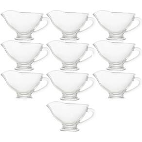 Garantia: 90 dias / Peso total: 2,8kg / Cor predominante: transparente / Referência: 7798139344685; Dimensões de cada molheira: 15cm (C) x 7cm (L) x 8cm (A); Conteúdo: 10 molheiras de cristal; Capacidade de cada: 180ml; Material: cristal.