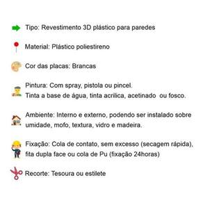 1- Você mesmo consegue instalar, não precisa de um profissional; 2- Material resistente, o relevo não amassa e não afunda; 3- Instalação sem sujeira e sem quebra quebra; 4- Ideal para paredes com umidade, mofo, textura, madeira e azulejo; 5- Serve tanto para áreas internas, quanto externas; 6- É lavável; 7- Durabilidade de 10 anos; 8- Não precisa de pintura; 9- Instalação com fita 3m, cola de contato ou cola PU; 10- Cortes das placas é a laser.