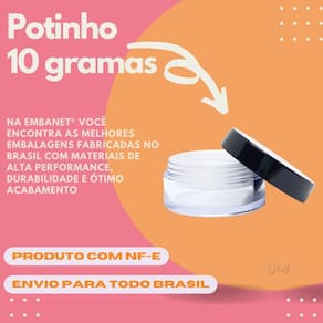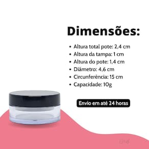Especificações do Pote: Altura total pote: 2,4 cm Altura da tampa: 1 cm Altura do pote: 1,4 cm Diâmetro: 4,6 cm Circunferência: 15 cm Capacidade: 10g