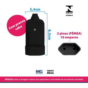 Características: Desmontável Resistente Melhor acabamento do mercado 2 pinos Com prensa cabos Compatíveis com diversos tipos de cabos paralelo, PP plano e PP circular Corpo em material termoplástico de alta qualidade Ligação dos condutores através de bornes parafusados 10A em tensões de até 250V Produtos Certificados pelo INMETRO no requisito de SEGURANÇA pelo organismo de certificação Bureau Veritas BV - OCP0018 Atendem ao padrão brasileiro de plugues e tomadas NBR 14136 Não acompanha cabo Produto testado e aprovado por Mega Aquários Compre nesse anúncio com segurança diretamente com um revendedor oficial Margirius.