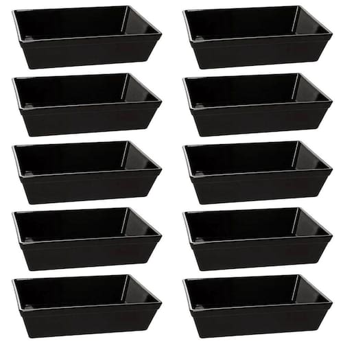 Garantia: 90 dias / Peso: 3,28kg / Cor predominante: preto / Referência: 101830008X10; Dimensões de cada: 32,5cm (C) x 17cm (L) x 7cm (A); Capacidade de cada: 3 litros; Conteúdo: 10 travessas; Material: polipropileno (PP).