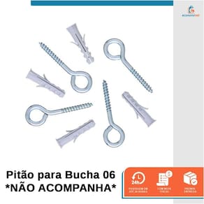 Parafuso Pitão para Bucha em Aço Carbono Zincado.• Para buchas de 6mm de diâmetro.• Pitão: São utilizados para fixação como elementos de apoio em superfícies de madeira e alvenaria.• Alguns exemplos de aplicação: Artesanato, bricolagem, marcenaria, etc.Indicado para Fixação em Alvenaria e Concreto.Conteúdo da embalagem:• 100 Ganchos PitãoMarca: StarferRef.: 11641024