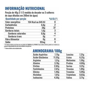 Informações Nutricionais por porção de 40g Valor energético: 159 kcal Proteínas: 24g Carboidratos: 9,8g Gorduras totais: 2,6g saturadas: 1,6g Creatina: 3000mg BCAA glicina : 2980mg Taurina: 2000mg Sódio: 88mg Sugestão de Uso: Misture 40g do produto em 200ml de água ou leite e consuma de 2 a 3 vezes ao dia, sendo uma delas logo após o treino.