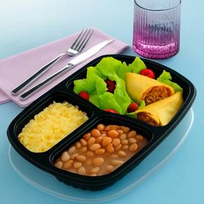 Bandeja Refeição com 3 Divisórias Galvanotek G331, capacidade total de 850ml, ideal para o segmento food service, desenvolvida para garantir praticidade, segurança e apresentação profissional das refeições. Produzida em material resistente e de alta qualidade, possui base preta elegante que valoriza os alimentos e tampa transparente que proporciona excelente visibilidade do conteúdo, facilitando a identificação sem necessidade de abrir a embalagem. Suporta utilização em freezer e micro-ondas, sendo perfeita para congelamento, armazenamento e reaquecimento, sem comprometer a estrutura ou a vedação. Seu design com 3 compartimentos permite separar diferentes preparações na mesma embalagem, preservando o sabor, a textura e a qualidade de cada alimento. Com dimensões de 26,8 x 18,3 x 4 cm, oferece espaço adequado para refeições completas, tornando-se uma escolha prática e higiênica para marmitarias, restaurantes, delivery e serviços de catering. Embalagem com 100 unidades, garantindo excelente custo-benefício e otimização de processos no dia a dia.