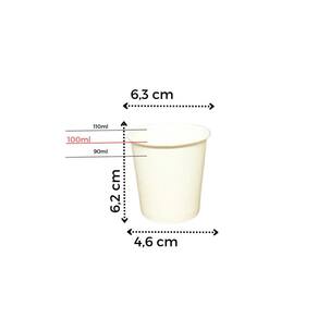 100 ml auferido e 110 ml volume total. Pacote com 50 unidades. 2x50 Medidas: altura: 62mm boca: 63mm fundo: 46mm Conteúdo da embalagem: 100 copos de papel biodegradável branco 110ml