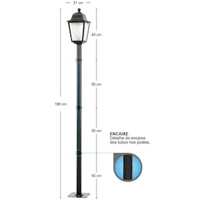 Garantia: 90 dias / Peso total: 25,200kg / Cor predominante: preto / Ref: 7794463072942; Dimensões totais dos postes: 21cm (C) x 21cm (L) x 195cm (A); Soquete: E27, não acompanha lâmpada; Materiais: polipropileno e alumínio; Potência: até 20W; Voltagem: bivolt; Conteúdo: 12 luminárias de piso.
