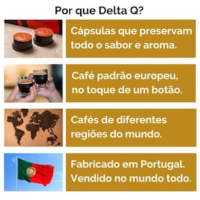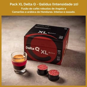 Sobre a Delta Q- Café desenvolvido conforme padrão europeu no conforto da sua casa.- As cápsulas Delta Q preservam sabor e aroma, para que você deguste uma bebida fresca.- Cafés vindos de vários lugares no mundo, em diferentes intensidades.- Produto europeu, sucesso mundial. Conteúdo 2 caixas com 40 cápsulas Delta Q. SaborQalidus Intensidade 10 Fusão de cafés robustas de Angola e Camarões e arábica de Honduras. Espresso encorpado, com forte presença na xícara, com leve acidez e notas de caramelo. Sem açúcar.Modelos de cafeteiras compatíveis As cápsulas funcionam em todos os modelos de cafeteira Delta Q.Atenção: essas cápsulas não funcionam nas cafeteiras Nespresso, Três Corações e Dolce Gusto pois essas marcas usam outros modelos de cápsulas. Observações - Validade: 6 a 12 meses- Fabricado em Portugal
