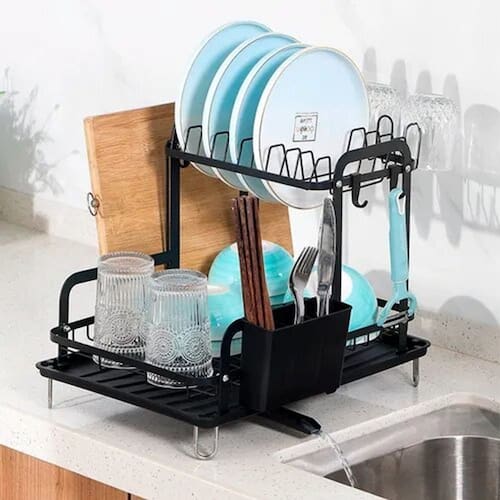 Escorredor de Louças Grande com Bandeja ¿ Preto O Escorredor de Louças Grande com Bandeja Preto é a solução ideal para manter a cozinha organizada com praticidade e estilo. Possui design de 2 camadas com suportes adicionais, oferecendo espaço suficiente para pratos, copos, canecas, talheres, tigelas e até panelas. A bandeja coletora removível facilita a limpeza e evita o acúmulo de água na bancada, garantindo mais higiene no dia a dia. Características do Produto: Material: Ferro + Plástico resistente Cor: Preto Estrutura: 2 camadas com suportes para pratos, xícaras e utensílios Dimensão do produto: 33 x 37 x 42 cm Dimensão da embalagem: 11 x 32 x 44 cm Peso com embalagem: 2,100 kg Benefícios: Organização eficiente: acomoda diferentes tipos e tamanhos de utensílios. Suportes adicionais: espaço exclusivo para talheres, utensílios e xícaras. Praticidade: bandeja coletora removível para fácil higienização. Estilo sofisticado: acabamento preto elegante que combina com qualquer cozinha. Economia de espaço: design vertical que otimiza a bancada. Destaques: Design de 2 camadas para maior capacidade. Suportes específicos para utensílios e xícaras. Bandeja removível de fácil limpeza. Estrutura robusta e durável. Marca: Não Informado