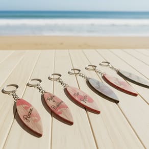 Prancha de Surf Recortada em Madeira e Gravada em Pirografia – Personalizada Mini prancha de surf artesanal, recortada em madeira e decorada com gravação em pirografia, oferecendo um design único e detalhado. Pintada com tinta acrílica, pode ser utilizada como chaveiro ou troféu de mesa, além de ser perfeita para a montagem de trabalhos manuais e painéis decorativos. Características: