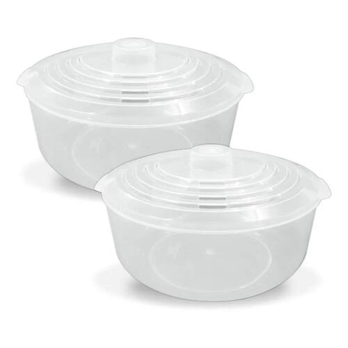 Panelas multiuso para micro-ondas, ideais para preparar arroz, legumes e pipoca. Conjunto com 3 unidades, cada uma com capacidade de até 2 litros.