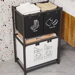 Ideal para banheiros, lavanderias e quartos, o Cesto Triplo de Roupas Sujas otimiza seu espaço, mantém sua casa organizada e torna a tarefa de lavar roupas muito mais simples e prática.