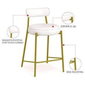 Banqueta Cozinha Média Com Encosto Industrial Dourado Londres Pu Branco D03 - D'rossi Renove sua cozinha, área gourmet ou ambiente comercial com a Banqueta Média Londres em sintético PU Branco. Com 85 cm de altura total e 65 cm do assento ao chão, possui a proporção perfeita para bancadas e ilhas médias, garantindo conforto e ergonomia em cada uso. A estrutura em aço carbono na cor dourada combinada à madeira de reflorestamento assegura resistência e durabilidade, enquanto o acabamento em pintura epóxi protege e realça o visual industrial da peça. O assento e o encosto fixos, estofados em espuma D-26 de alta densidade, proporcionam maciez e sustentação ideais. O revestimento agrega sofisticação e é fácil de limpar, mantendo o aspecto elegante por muito mais tempo. Seu design industrial apresenta base metálica vazada, que traz leveza visual e robustez estrutural, além de apoio para os pés integrado e capacidade para até 120 kg com total segurança. A Banqueta Londres é a escolha certa para quem busca elegância, praticidade e conforto em um só produto. Dimensões do Produto:
