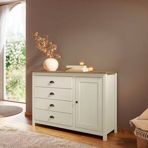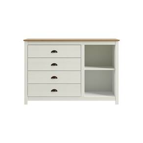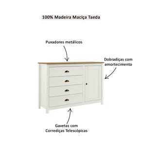 Características: Estrutura em Madeira Maciça Pinus Taeda de reflorestamento Pintura Semi-brilho 01 Porta com dobradiças com amortecimento 04 Gavetas com corrediças telescópicas Puxadores metálicos em ouro envelhecido Pés alongados em madeira Amplo espaço para armazenamento Peso máximo suportado pelas gavetas 05kg distribuídos Peso máximo suportado pelas prateliras 10Kg distribuidos Peso máximo suportado pelo tampo 30Kg distribudos